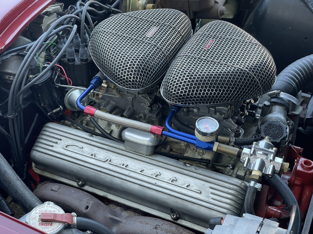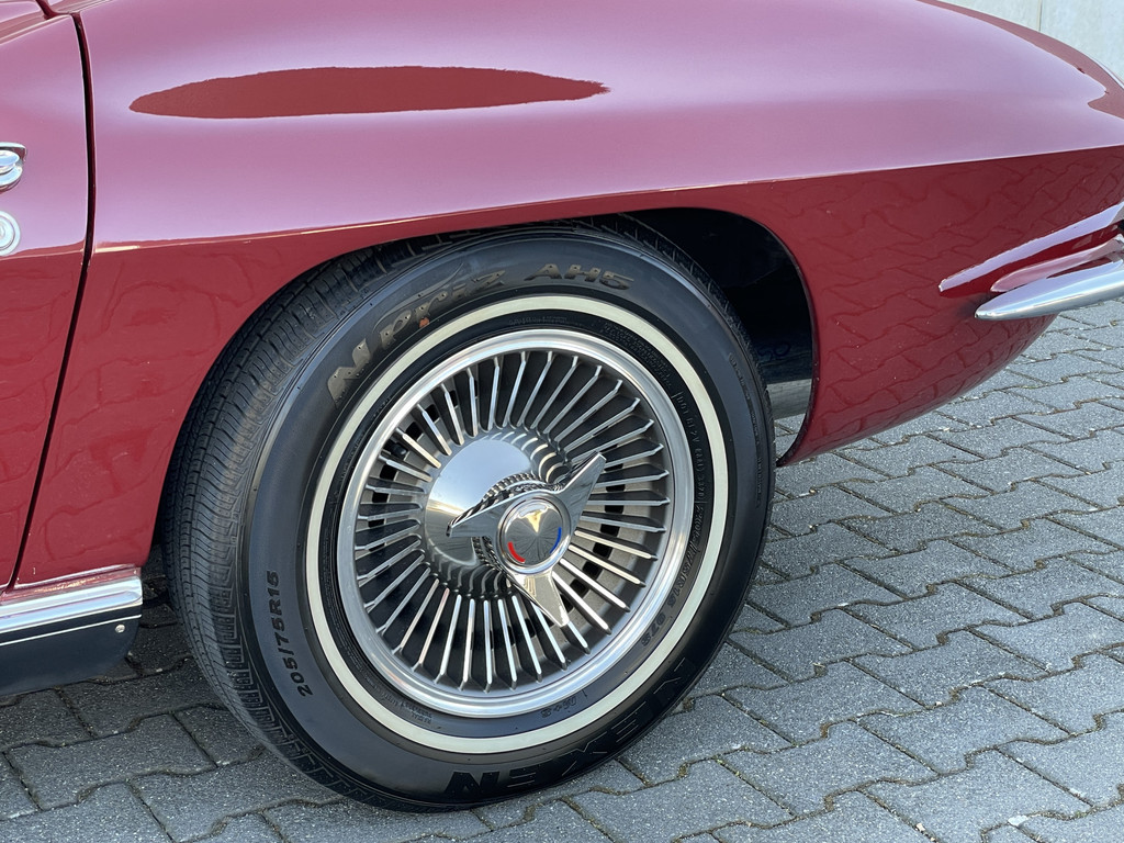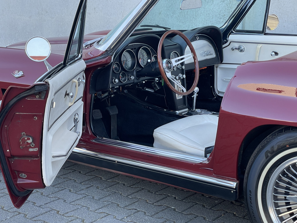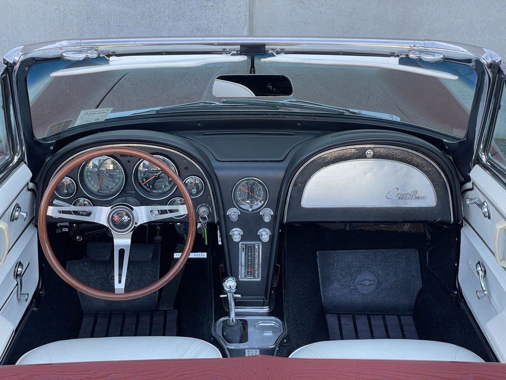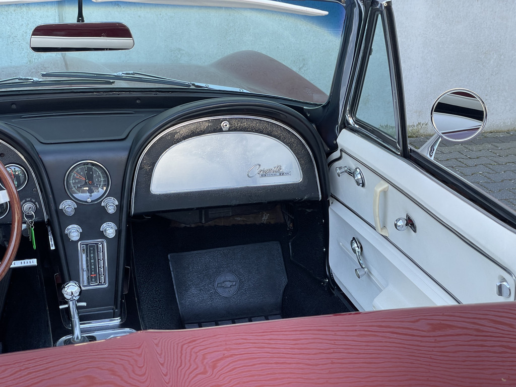 Onder de lange motorkap ligt een levendige 327 V8, gekoppeld aan een handgeschakelde vierversnellingsbak. De motor start moeiteloos en loopt prachtig rond. Dankzij de dubbele Edelbrock 4-barrel carburatie beschikt deze Stingray over extra vermogen én een rijk, karakteristiek V8-geluid dat perfect past bij zijn uitstraling. Elektrische stuurbekrachtiging zorgt daarbij voor extra comfort tijdens het rijden, zonder de authentieke beleving te verliezen.