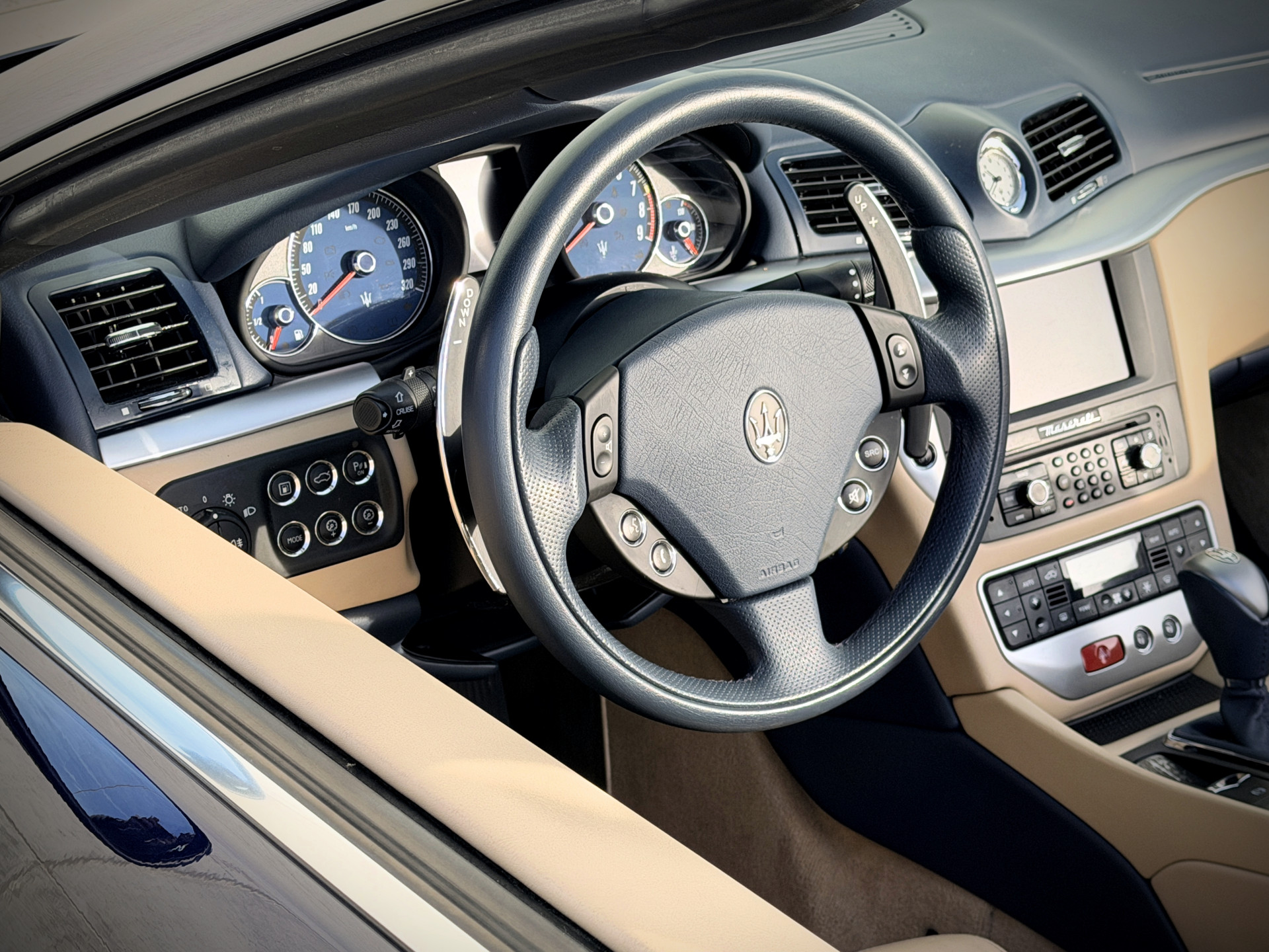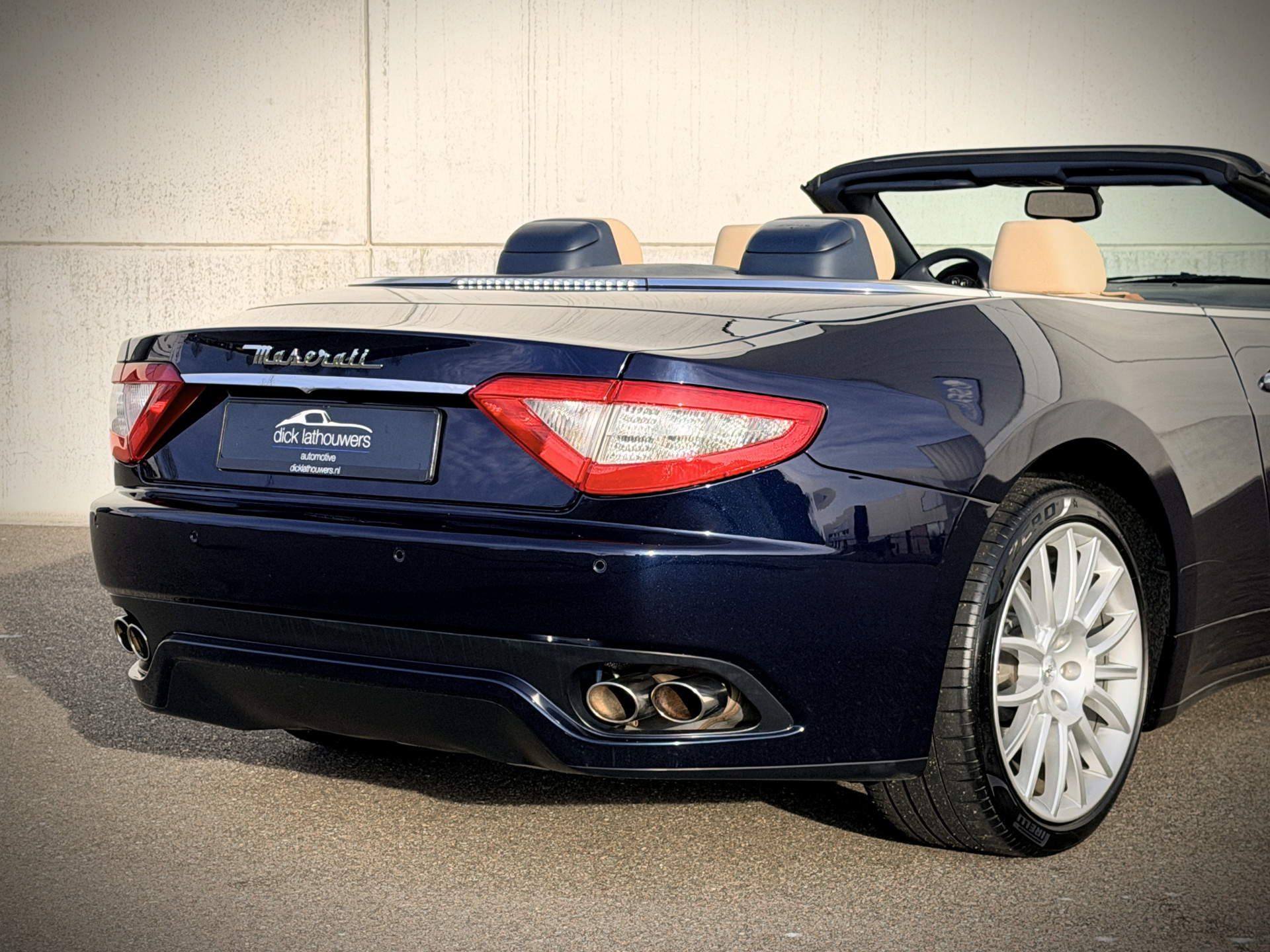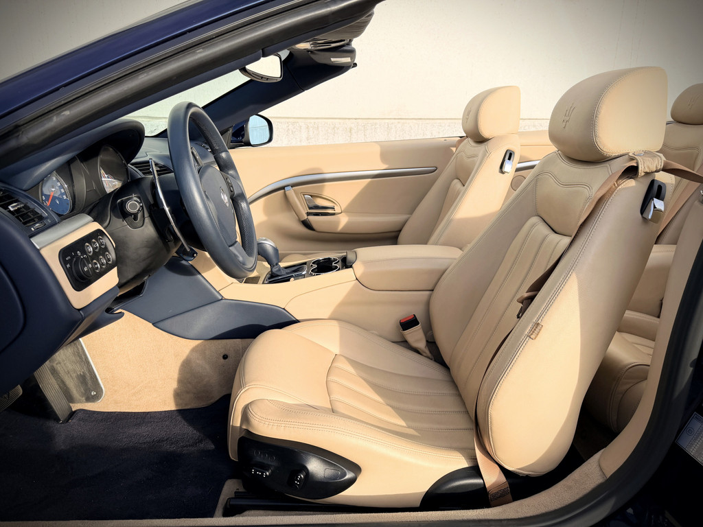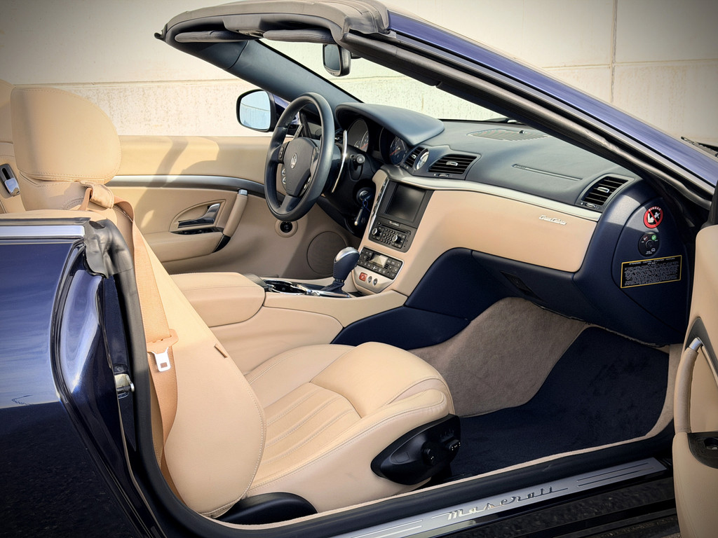 De verschijning van deze GranCabrio is pure verleiding. Blu Oceano, diep en elegant, komt onder daglicht tot leven en vormt een onweerstaanbare combinatie met de warme Sabbia lederen bekleding. Het interieur wordt verder verfijnd door Blu Navy accenten, waardoor een sfeer ontstaat van tijdloze luxe en mediterrane klasse — licht, luchtig en verfijnd. Je voelt onmiddellijk die typisch Italiaanse mix van smaak, flair en vakmanschap: nergens overdreven, overal precies raak.