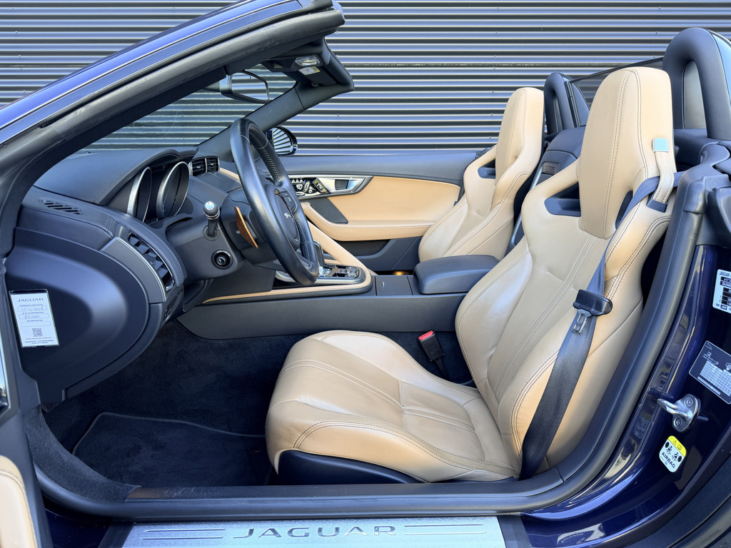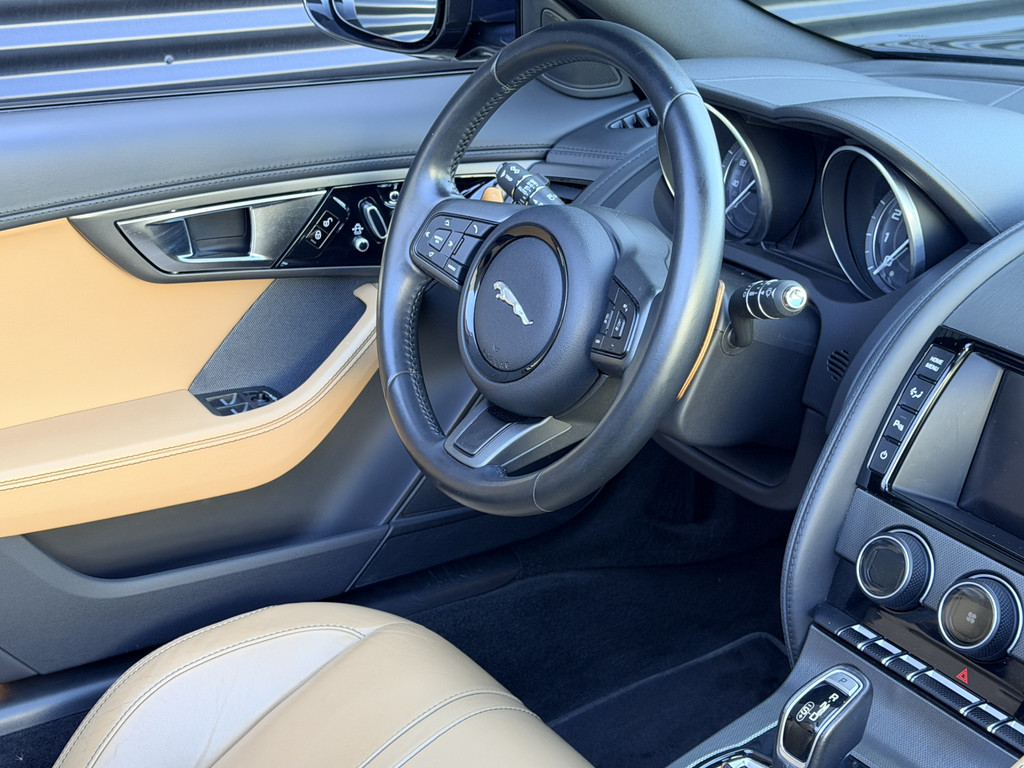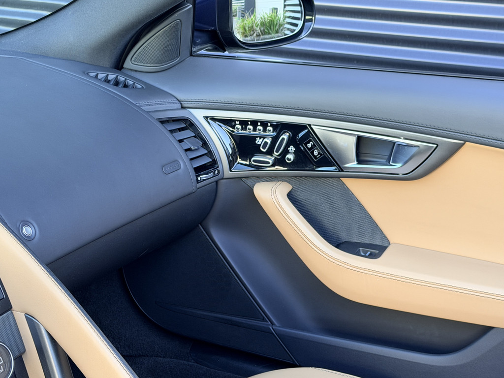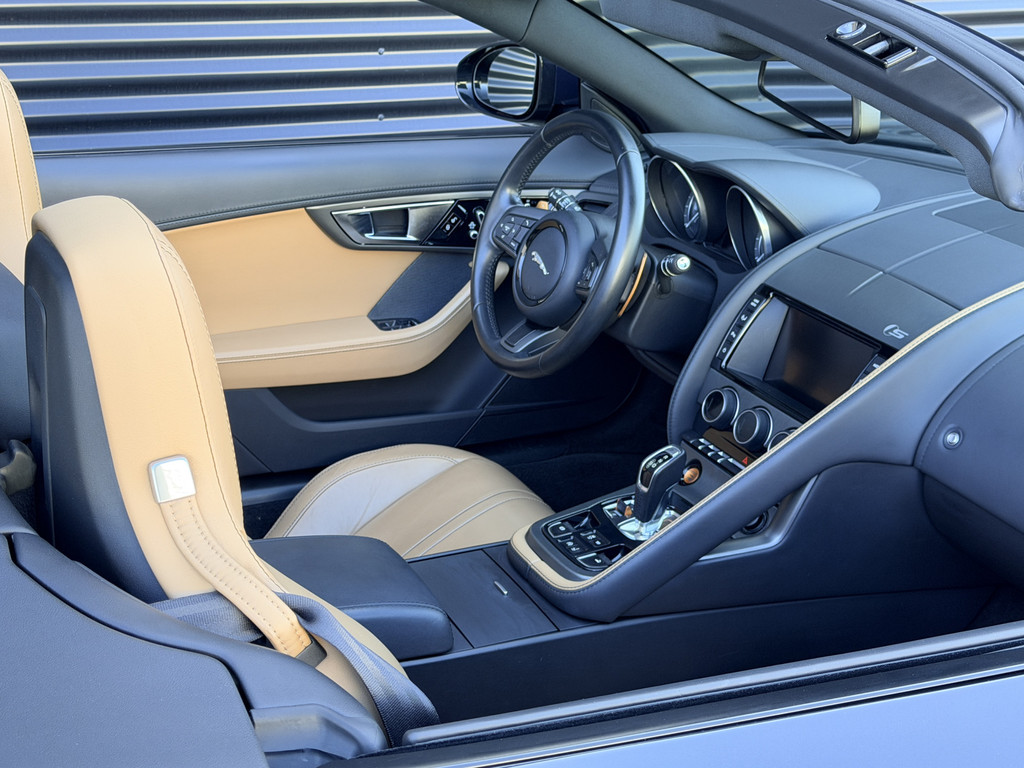 Deze F-Type is uitgevoerd in het elegante Blu Sapphire metallic, een kleur die het gespierde design van de auto prachtig benadrukt. Het interieur vormt een stijlvol contrast met beige leder, voorzien van sportieve Performance-stoelen die elektrisch 14-voudig verstelbaar zijn en uiteraard zijn uitgerust met stoelverwarming. Een cockpit die perfect aansluit bij het karakter van de auto: sportief, luxueus en volledig gericht op de bestuurder.