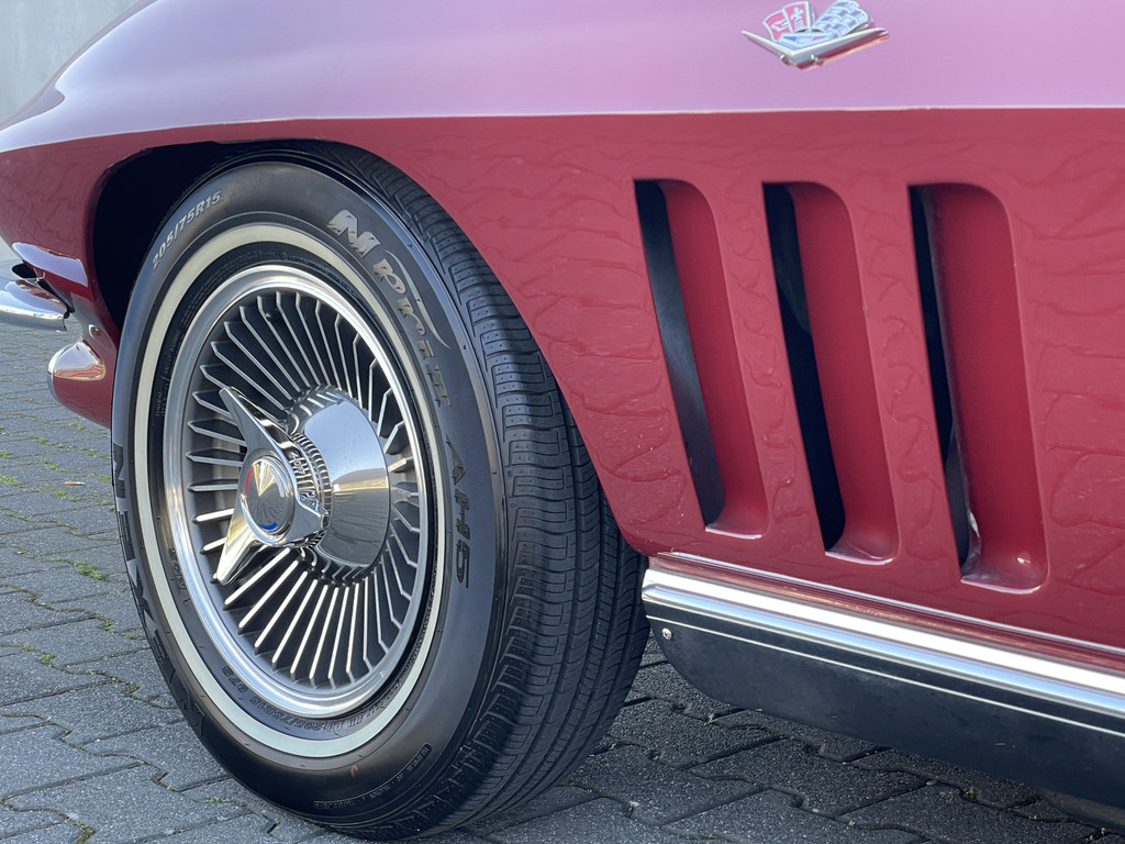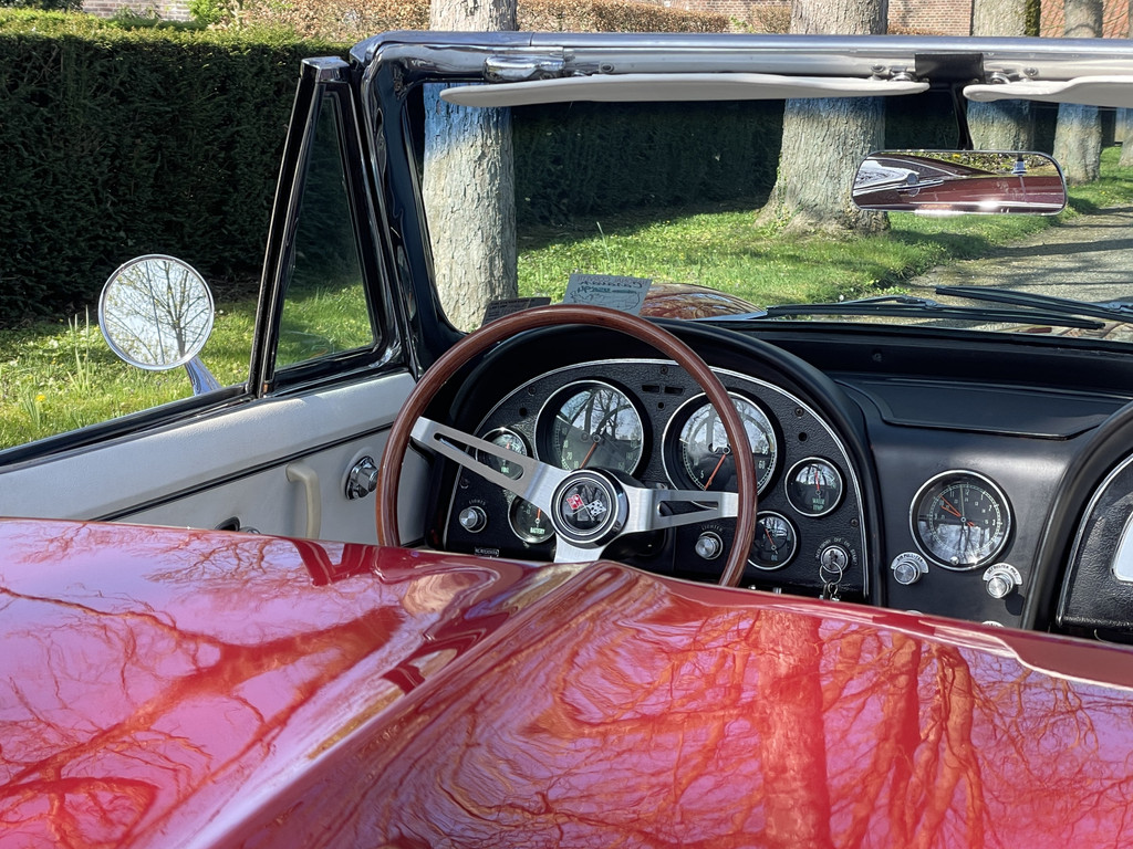Onder de lange motorkap ligt een levendige 327 V8, gekoppeld aan een handgeschakelde vierversnellingsbak. De motor start moeiteloos en loopt prachtig rond. Dankzij de dubbele Edelbrock 4-barrel carburatie beschikt deze Stingray over extra vermogen én een rijk, karakteristiek V8-geluid dat perfect past bij zijn uitstraling. Elektrische stuurbekrachtiging zorgt daarbij voor extra comfort tijdens het rijden, zonder de authentieke beleving te verliezen.