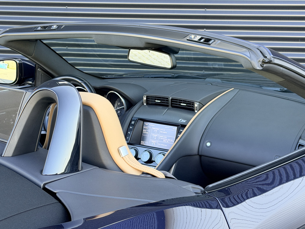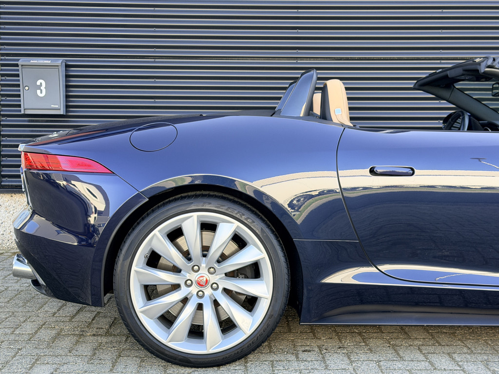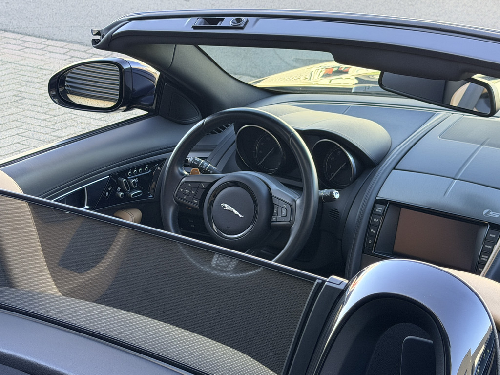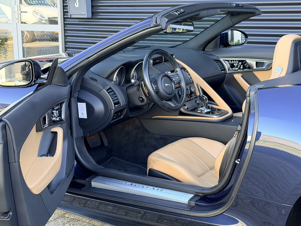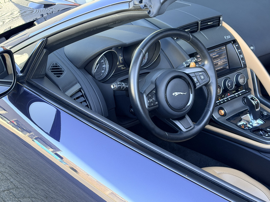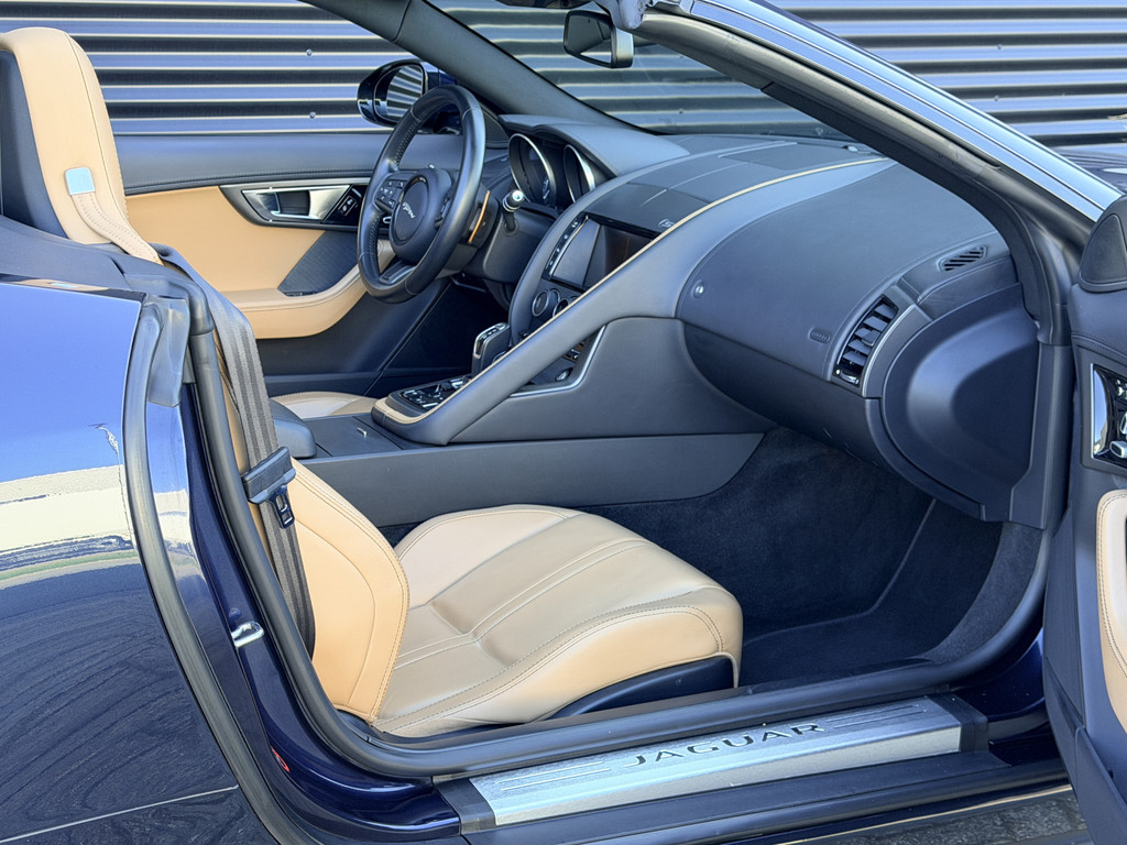 Deze F-Type is uitgevoerd in het elegante Blu Sapphire metallic, een kleur die het gespierde design van de auto prachtig benadrukt. Het interieur vormt een stijlvol contrast met beige leder, voorzien van sportieve Performance-stoelen die elektrisch 14-voudig verstelbaar zijn en uiteraard zijn uitgerust met stoelverwarming. Een cockpit die perfect aansluit bij het karakter van de auto: sportief, luxueus en volledig gericht op de bestuurder.